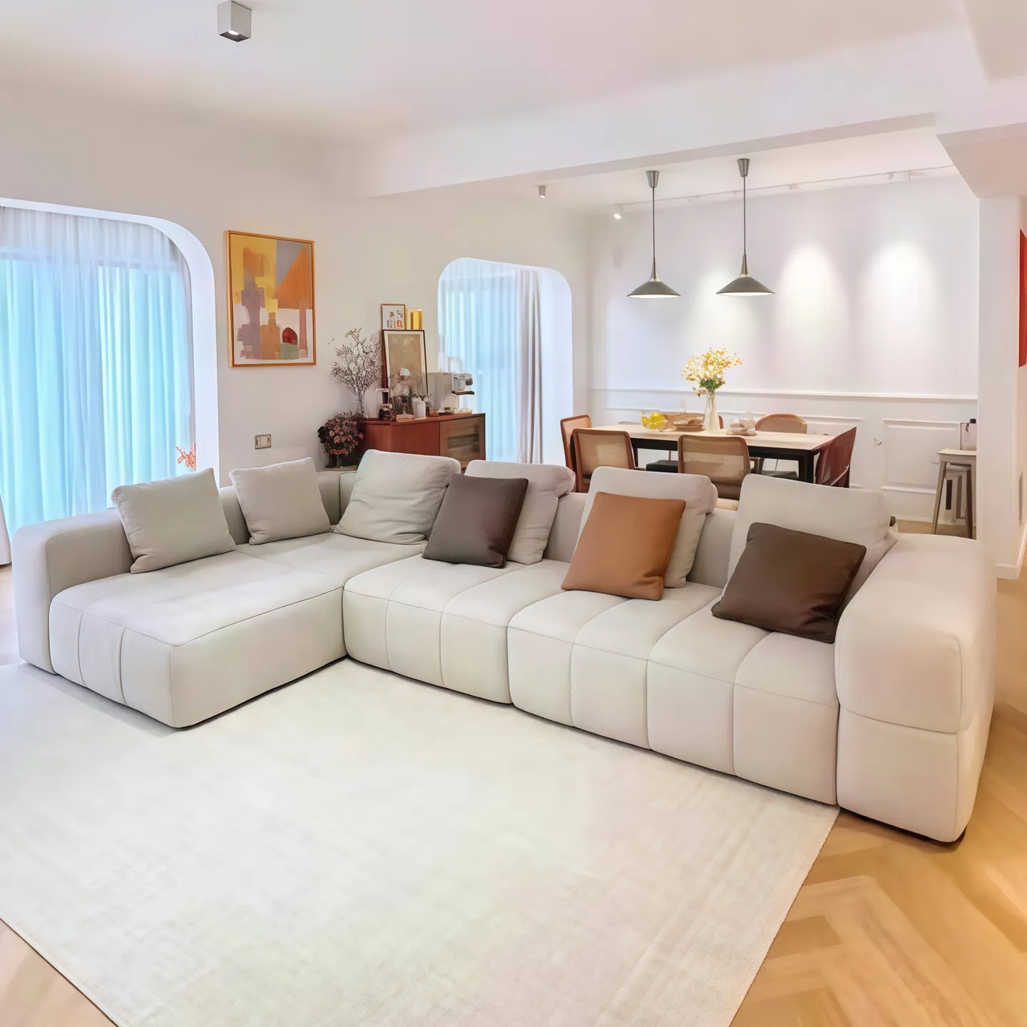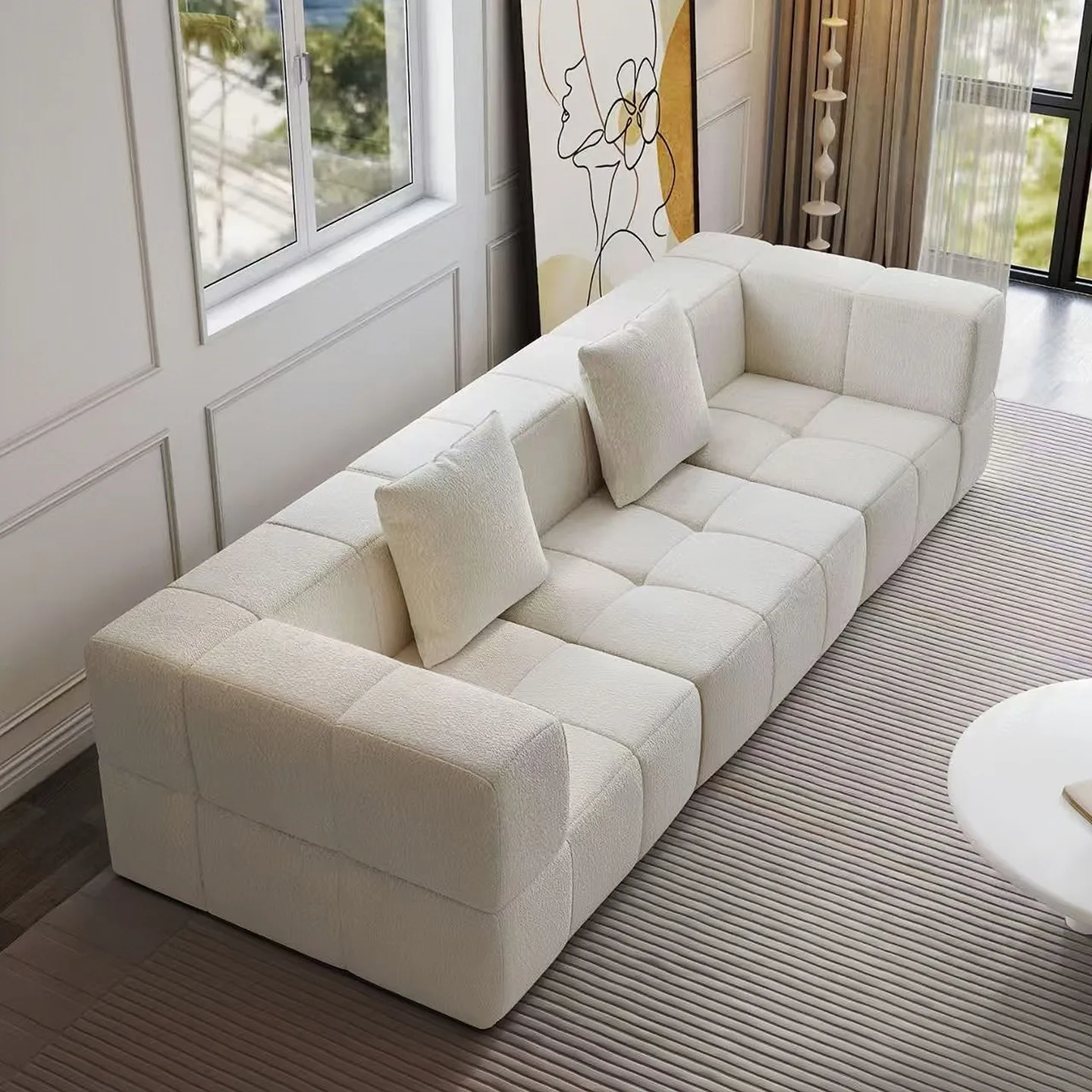 Диван с высокой степенью свободы, состоящий из свободно перемещаемых подушек и раздельных модулей сидений, сочетающий в себе высокоэластичную пену и мягкую обивку от мастеров-ремесленников.